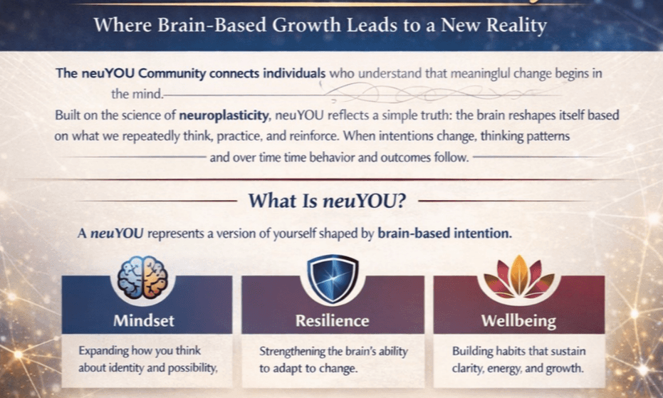 Connect with individuals committed to intentional growth and brain-based transformation. Engage in meaningful conversations about mindset, resilience, wellbeing, and navigating life transitions.